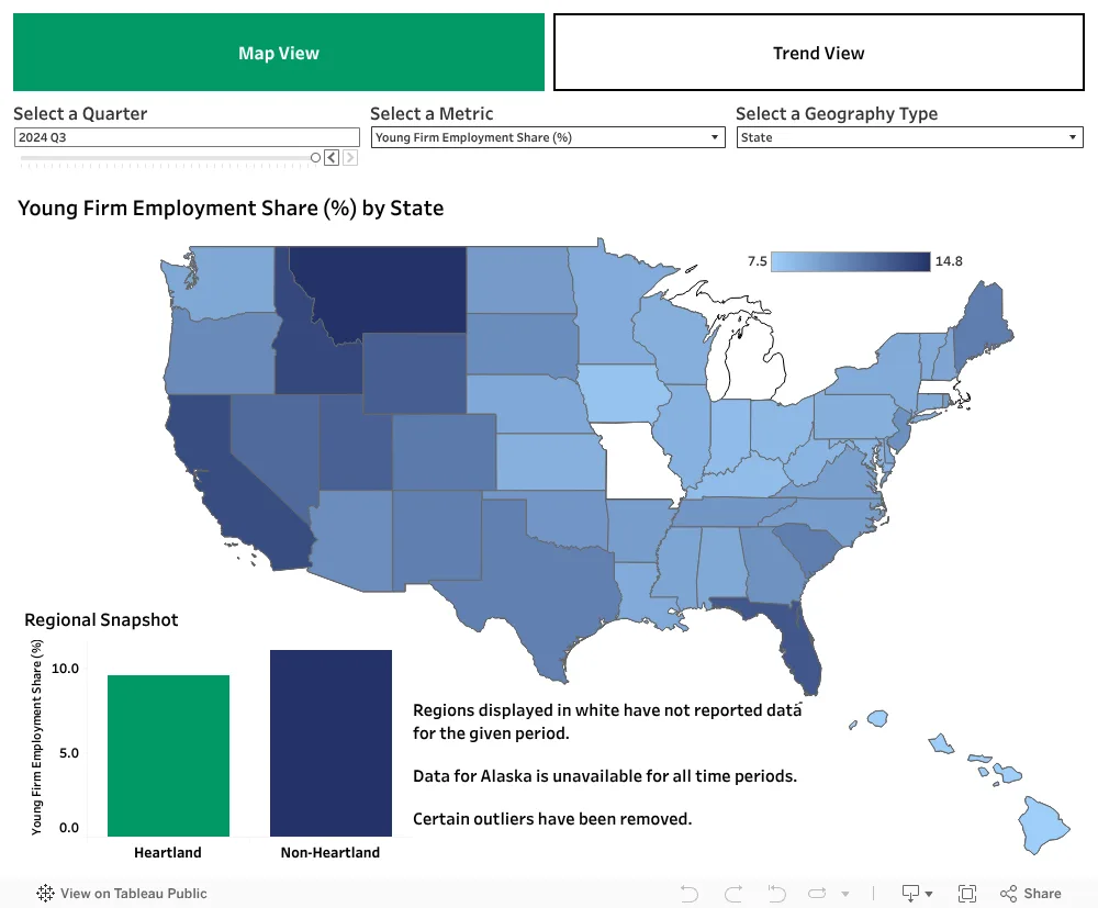 - Map View: Compare regions’ performance using our two metrics. Benchmark bars show how the heartland and non-heartland areas are performing on average, offering quick context for each selection. These values correspond to the selected geography type, so when the user selects “Metropolitan Statistical Area” and “Young Firm Employment Share,” the heartland bar represents the (population-weighted) average Young Firm Employment Share across all heartland metros for the given quarter.