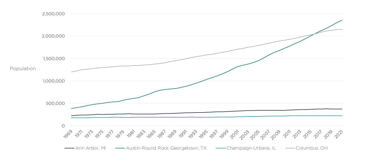 Since then, their growth has diverged widely. Austin’s population grew to more than a million by the mid- 1990s, to 1.5 million by the mid-2000s, and nearly 2.3 million in 2020, an overall growth rate of 472%. Even though Columbus started out much larger, its population still exploded to 2.1 million people by 2020 – an overall growth rate of about 75%. Over the same period, Ann Arbor’s population grew to just 370,000, a growth rate of 59%. It is still not the size that Austin was in 1970. Champaign-Urbana grew even slower, at a rate of 24% over this period.