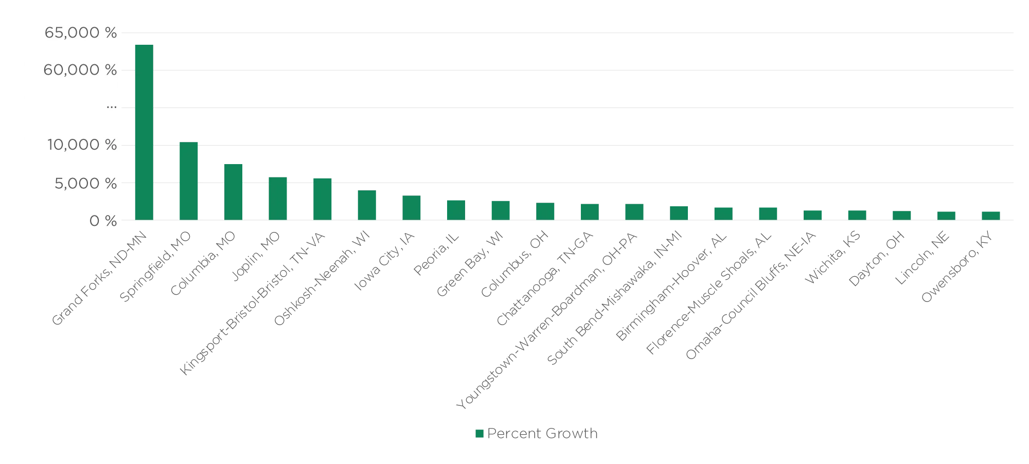 - Grand Forks, North Dakota posted an astounding growth rate of more than 63,000% – the second fastest of any metro in the country.