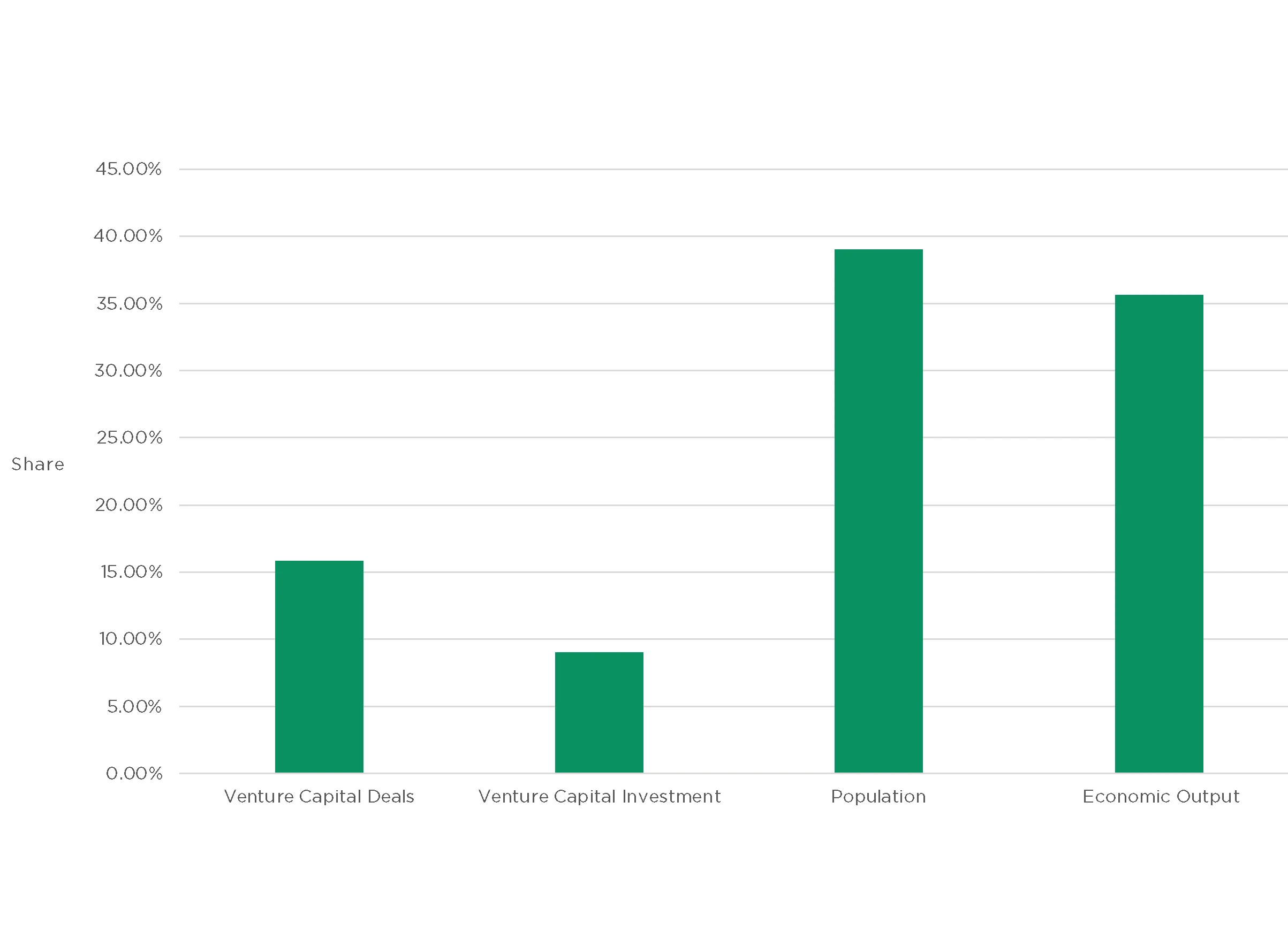 We also compared venture capital activity to population and economic output. Population data is from the U.S. Census Bureau’s American Community Survey 5-year Estimates.43 Data on economic output is based on gross domestic product for metropolitan areas from the Bureau of Economic Analysis.44
