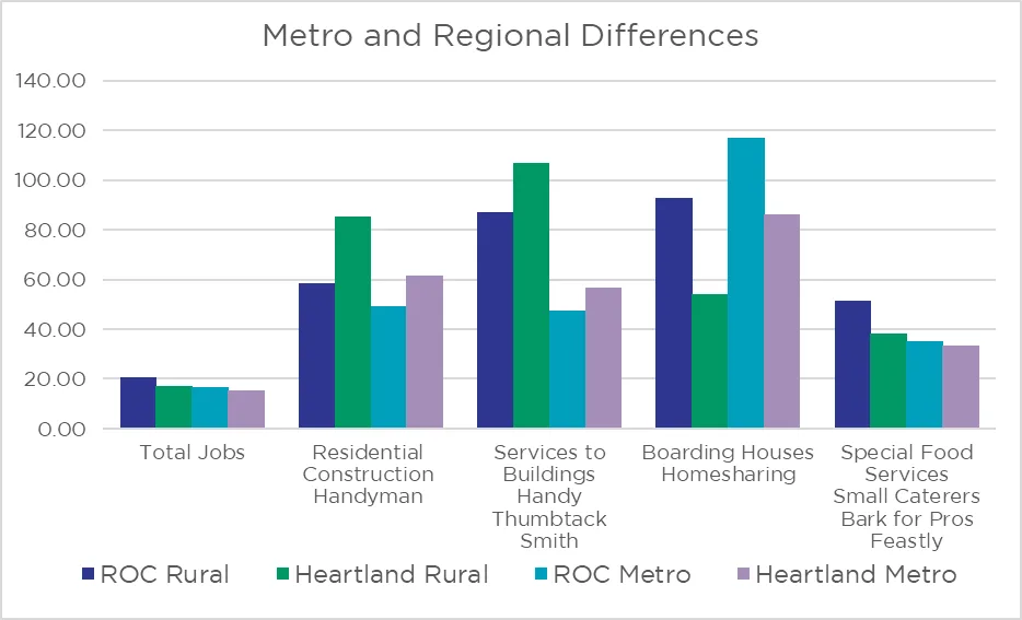 Here I consider some industry specific⁴ rates of self-employment to see if they vary across the U.S. The industries chosen are the broad industry groups that encompass some of the more popular “gig economy” fields. The names of some popular apps⁵ or services that facilitate self-employment are listed below the industry labels. Like total employment, the self-employment rates in residential construction, building services, boarding houses, and special food services vary across metro and rural areas and in the heartland relative to the rest of the county. Only in special food services does the pattern match total employment with heartland and metro areas having lower self-employment rates. For residential construction and building services, self-employment is more frequent in heartland and rural regions. For boarding houses we see higher rates of self-employment relative to number of employees outside the heartland and in metro areas.