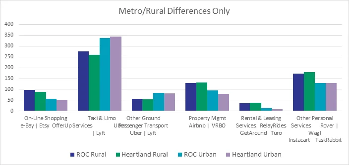 Once again, the direction of the difference varies with the labor market. In online shopping, property management, rentals and leasing services, and other personal services we see a higher propensity for self-employment in the rural areas. In the taxi and limo services, and other passenger transport, we see a higher propensity for self-employment in the metro areas.
