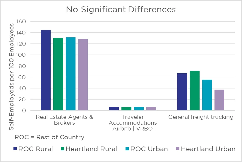 There are six industries where differences between metro and rural areas are obvious, but the heartland does not appear to have a self-employment propensity that differs from the rest of the county.