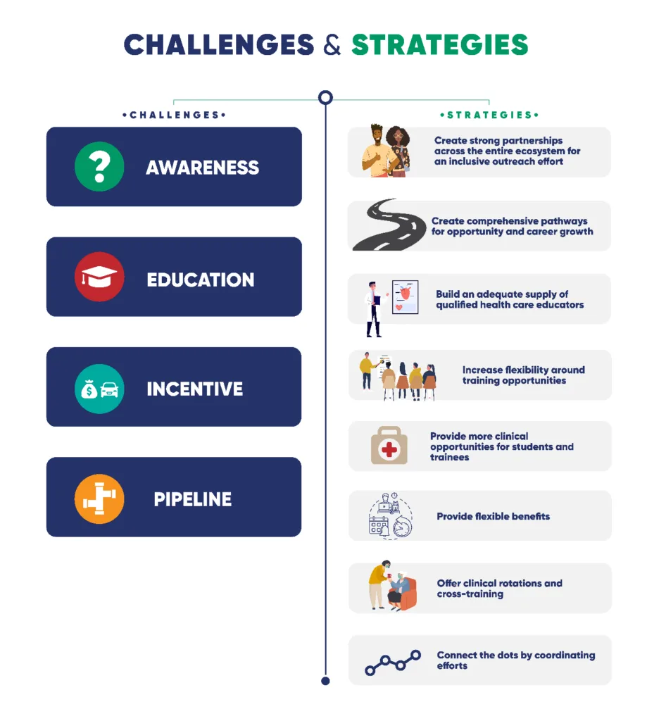 - Awareness. Many potential employees don’t know about the career and professional growth opportunities in these health care roles.